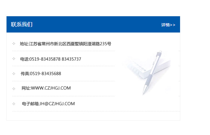 傳真:0519-83435688    郵編:213135    網(wǎng)址:WWW.czjhgj_com.sdtdjd.com    電子郵箱:JH@czjhgj_com.sdtdjd.com